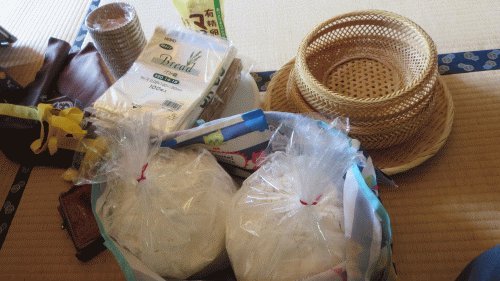 大分県産の強力粉4キロ、パン袋数種、竹細工など